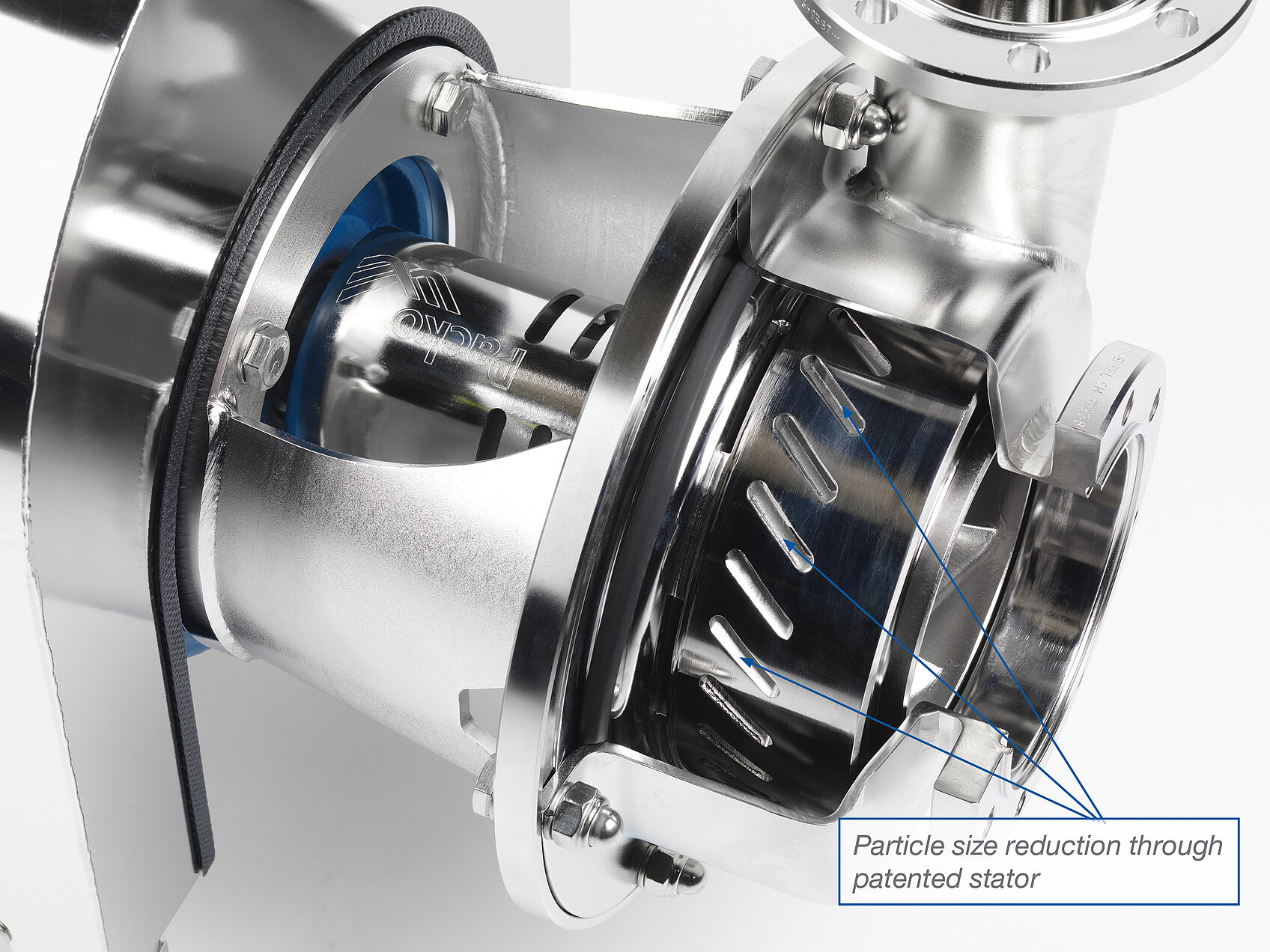 Le stator breveté spécialement conçu, avec un faible jeu entre le rotor et le stator génère un cisaillement important qui se traduit par une réduction significative de la taille des particules (entre 1,4 et 2 microns)! Cette réduction donne un produit fini plus stable!
