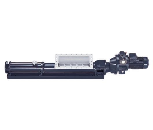 Modell VPR mit Einfülltrichter. Diese Pumpe ist mit einem Einlauftrichter und einer Transportschnecke ausgestattet, um die Produktzuführung zu sichern. Sie wird zur Förderung von hochviskosen Medien oder Dickstoffen mit geringer Eigenfließfähigkeit eingesetzt.