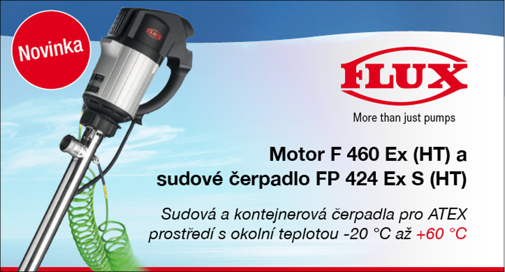 Jsme jediný výrobce na světě, který nabízí sudová čerpadla do +60 °C s certifikací ATEX. Čerpadla FLUX (HT) využijete při výstavbě zařízení v oblastech petrochemie, zpracování ropy a plynu, při čerpání inhibitorů koroze, inhibitorů obecně, odpěňovačů apod.